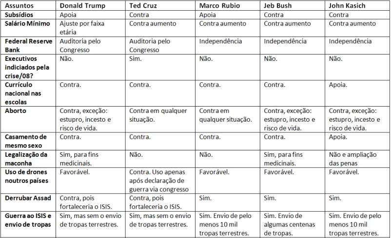Vejamos alguns pontos discordantes entre os seus cinco principais candidatos nas primárias de 2016: